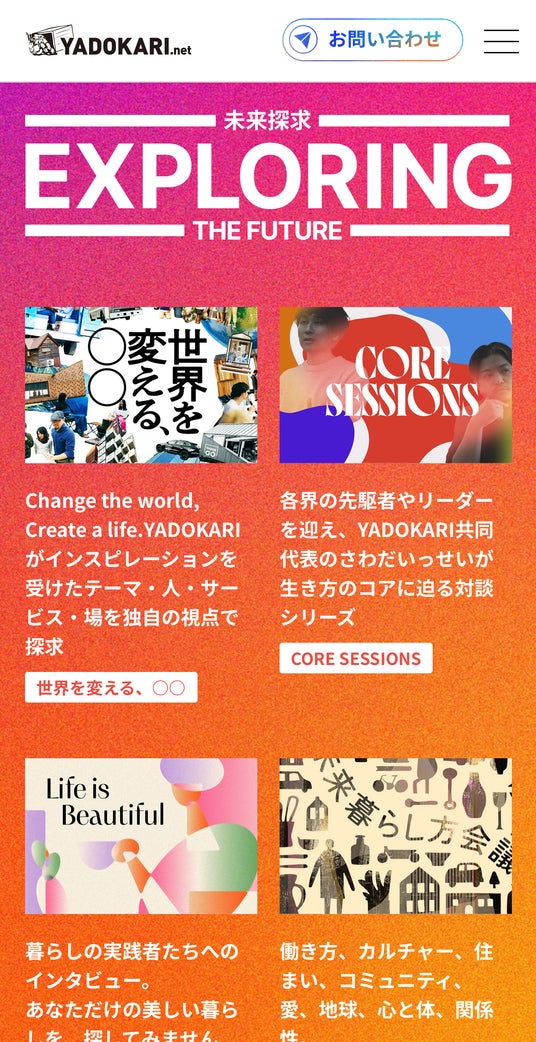 EXPLORING THE FUTURE~未来探求~:「世界を変える、暮らしを創る」をビジョンに掲げるYADOKARIが自身の好奇心に従い、多様な生き方と暮らしのカタチに触れ、未来のライフスタイルを探求していくLABメディア。これまで約10年間蓄積してきたYADOKARI独自の企画・インタビュー・コラムを掲載。