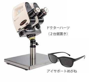 『目をマモル君』は、厚生労働省承認の医療機器『ドク ターハーツ』(2台据置き)と、視力トレーニング用『ア イサポートめがね』を組み合わせた業務用視力ケアセッ トです。