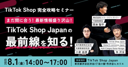 健康食品・化粧品のD2CおよびOEM事業を展開する武内製薬株式会社(本社:東京都品川区西五反田 代表取締役:小倉 由渡)とTikTok Shopパートナー認定企業である株式会社コマースファクトリー、TikTok Shop Japan 3社合同のTikTok Shop 完全攻略セミナーを2025年8月1日に渋谷ヒカリエで開催します。