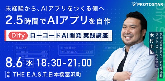 挑戦者支援をミッションに掲げるプロトスター株式会社(本社:東京都中央区、代表取締役:前川英麿)は、非エンジニアのビジネスパーソンを対象に、「【未経験から、AIアプリをつくる側へ】2.5時間でAIアプリを自作する『Dify ローコードAI開発 実践講座』」を、2025年8月6日(水)に開催いたします。