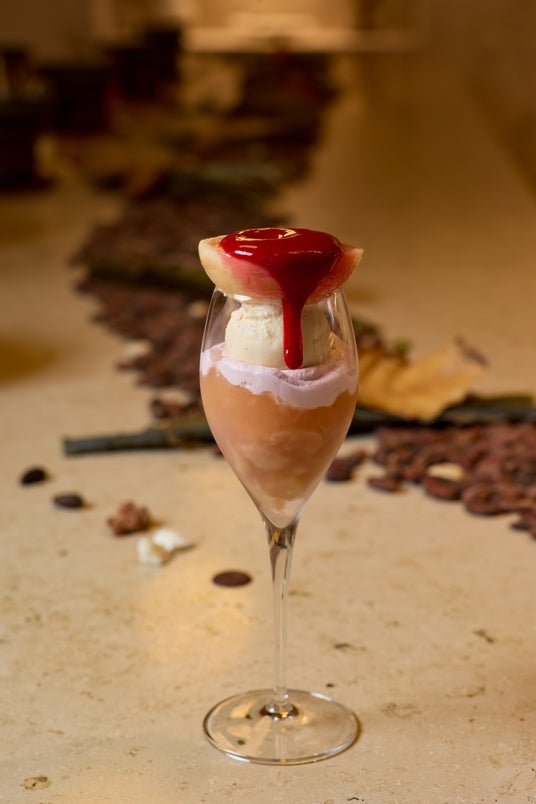 「赤」をテーマにスイカやトマトを用いて、各層ごとに全く異なる味や香りの変化をつけた組み合わせ。隠し味の味噌やハーブの風味によるサポートで、スイカやトマトを普段と違った角度でお楽しみいただけます。素材の新たな魅力を感じさせる、遊び心あふれる一杯です。