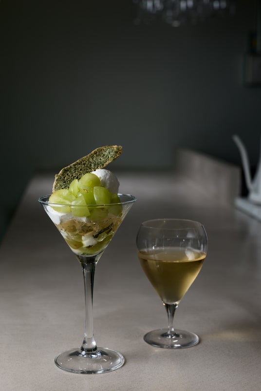 白葡萄と蕪のパフェ/1,950円葡萄を使ったパフェはTypicaのシェフ・相原氏が初めて作ったパフェでもあり印象深い素材。今回は「青さ」にフォーカスしてまとめました。見た目の青(緑)でもあり、成熟していない意味の青さ、野菜の苦味の青い香り、冷たさを表す青さ、夏の終わりの悲しさなど文脈で意味の変わる「青」を感じられるパフェです。