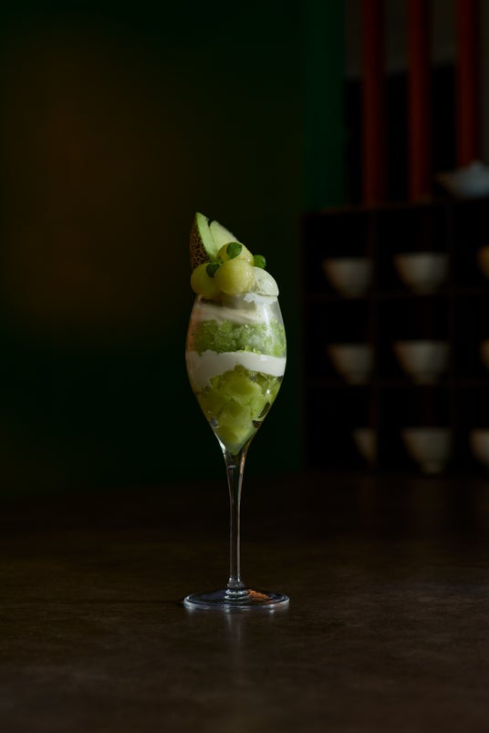メロンと和素材を組み合わせた、猛暑を乗り切るさっぱりとしたパフェ。メロンの素材の甘さを邪魔しないよう、甘さ控えめのパーツを組み合わせています。大葉の爽やかさと玄米茶の香ばしさ、クロモジの優しい薫りで主役のメロンを彩ります。