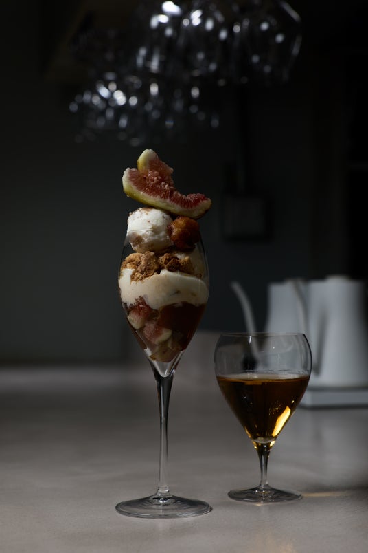 無花果と豆のパフェ/2,050円大豆は無花果の足りない所を優しく補ってくれる最高の相方。パフェを構成するとき、同じ方向性のアイテムでまとめるか反対方向から補い合うアイテムにするかのどちらかですが、無花果のパフェは後者です。自立した食材同士のため、熱量を感じる力強いパフェになりました。