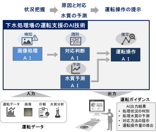 本技術は、将来的な熟練技術者減少に伴う技術力不足への対応として、判断根拠の見える化による技術継承や処理水質の安定化と運転管理の効率性の両立、維持管理コストの低減を図るべく構築したものです。操作履歴や水質分析、処理状況の画像などのデータからAIが処理状況を判断し、熟練技術者による運転操作と同様な判断をリアルタイムで提示するとともに、データを蓄積することでより最適な運転操作に寄与します。