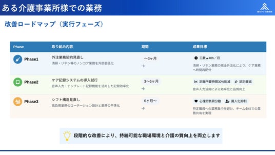 ある事業所では「非コア業務(清掃・送迎・記録等)」を棚卸・外注化・システム化することで、月間139.5時間のケア時間を創出。この時間を「利用者と向き合う時間」に再配分したことで、職員満足・サービス品質・定着率の向上につながっています。