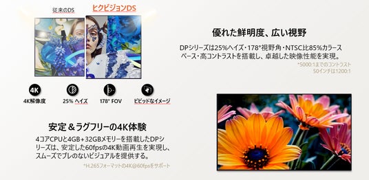 - 4K解像度 & 高輝度表示: 500~700ニットの高輝度パネルを搭載し、明るい環境下でも鮮明な映像を再現。25%ヘイズと178°の広視野角で、斜めからでもくっきり見えます。