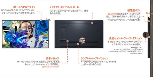 - 超薄型ボディ: 厚さ39.6mmのスリム設計で洗練された設置が可能。