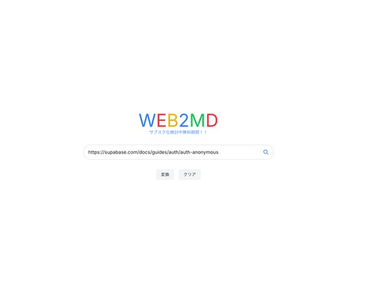 - CLI(コマンドライン)での利用例curl -L "https://web2md.fybe.jp/fetch?url=https://supabase.com/docs/guides/auth/auth-anonymous" > supabase-anon.md