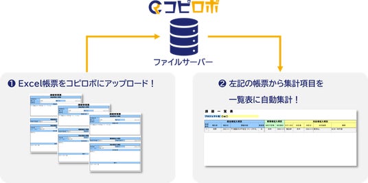 一覧表に集計したいExcel帳票をメールで『コピロボ』に送信することで、自動で「ファイルサーバー」にアップロード、一覧表に集計します。