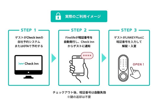 これにより、ゲストがCheck Inn経由で予約を完了すると、Finelifeが自動的にデジタルキー(暗証番号)を生成し、ゲストに通知します。ゲストはスタッフとの対面なしに、スムーズなチェックイン・チェックアウトが可能になります。