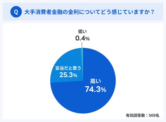 有効回答数509人のうち、大手消費者金融の金利が「高い」と回答した割合は74.3%でした。