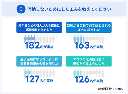 今回のアンケート対象者509名全員に滞納しないためにした工夫を質問したところ、「給料日などの収入が入る直後に返済期日を指定した」がもっとも多く、182名が実施していました。