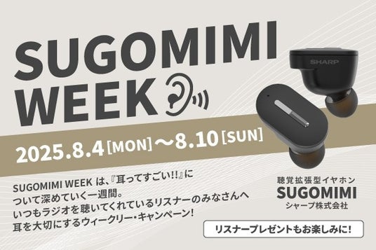 北海道のラジオ局、株式会社 FM NORTH WAVE(北海道札幌市)は、8/4(月)~8/7(木)の4日間、ワイド番組cottonsky内11:35~11:45の10分コーナー『daily updates』で、日常生活で忘れがちな“”耳の大切さを見つめ直すウィークリーキャンペーン、FM NORTH WAVE SUGOMIMI WEEKをお届けします。