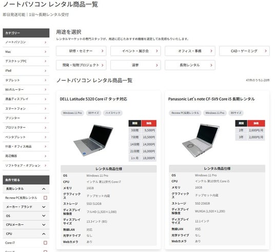 レンタルマーケット内ノートパソコンの先頭ページ(用途からもスペックからも検索が可能!)