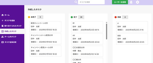 タスク一覧機能送信したタスクも受け取ったタスクも一覧で確認でき、ステータスごとにカード形式で表示。直感的に確認・編集できるため、伝達ミスや対応漏れを防ぎます。