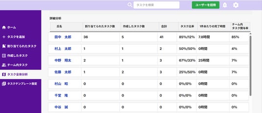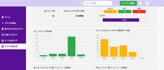 平均対応時間のランキングも確認でき、進捗が早い人や滞っているタスクの傾向もすぐに把握できます。