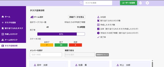 メンバーごとのタスク数・完了時間も簡単に確認が可能。