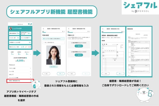 「はたらいて、笑おう。」をビジョンに掲げるパーソルグループのスキマバイトアプリ『シェアフル』やSaaSシフト管理サービス『シェアフルシフト』、就業実績を活用した人材紹介サービス『シェアフルエージェント』などを提供するシェアフル株式会社(本社:東京都港区、代表取締役社長:横井 聡)は、アプリの新機能として履歴書・職務経歴書機能を本日・2025年7月28日(月)のアップデートにて追加することをお知らせします。