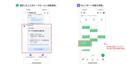 完了したことがトークルームにも共有され、カレンダーにも自動で予定が登録されます。