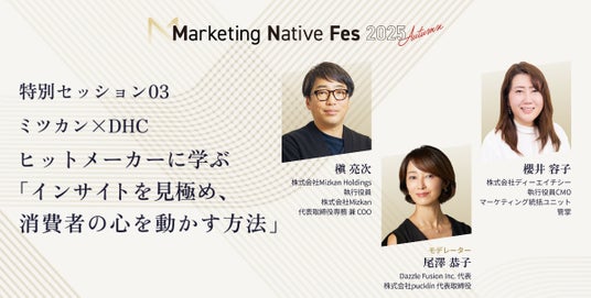 株式会社CINC(本社:東京都港区、代表取締役社長:石松友典、以下CINC)が運営するWebメディア「Marketing Native(マーケティング・ネイティブ)」は、10月8日(水)にANAインターコンチネンタルホテル東京で開催するイベント「Marketing Native Fes 2025 Autumn」の全特別セッションの登壇者が確定したことをお知らせいたします。新たに決まったのは、Mizkan Holdings 執行役員/Mizkan 代表取締役専務 兼 COO 槇亮次さん、ディーエイチシー 執行役員CMO マーケティング統括ユニット管掌 櫻井容子さん、Dazzle Fusion Inc. 代表/pucklin 代表取締役 尾澤恭子さんによる特別セッションです。