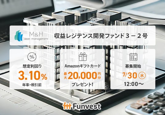 「未来をわかちあう投資」を提供する「Funvest(ファンベスト)」(以下、Funvest)は、「M&Hアセットマネジメント 収益レジデンス開発ファンド3-2号」(以下、本ファンド)の募集を7/30より開始しますので、お知らせいたします。
