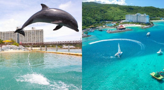 エメラルドグリーンのプライベートビーチ、客室は全室オーシャンビューで青く輝く海が見えるバルコニー付き。