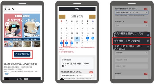 「RAN」モデルハウスの内見予約フォームを改善し、スマート内見全拠点導入に合わせ、7月28日(月)より新仕様にて公開します。今回の改善では、見学希望者が「有人内見」と「スマート内見」をよりスムーズかつ安心して予約できるよう、入力項目の簡素化、カレンダーを活用した日程選択の即時反映、見学拠点ごとの空き状況表示などを導入。予約完了までの導線を短縮し、スマートフォンからの利用にも最適化を図りました。