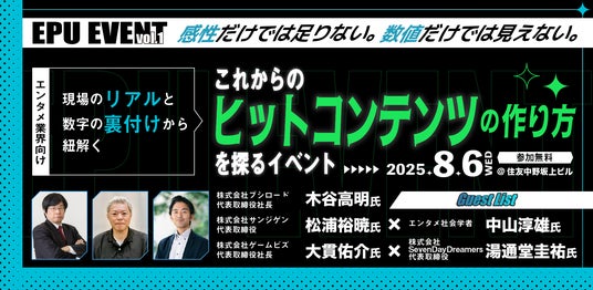 株式会社ブシロード (本社:東京都中野区、代表取締役社長:木谷高明)のグループ会社にあたる株式会社ゲームビズ(本社:東京都中野区、代表取締役社長:大貫佑介)は、エンタメ業界向け、これからのヒットコンテンツの作り方を探るイベント「EPU EVENT vol.1」を8月6日に開催することをお知らせいたします。報道関係の皆様におかれましては、ぜひ本情報をお取り扱いいただきますよう、お願い申し上げます。
