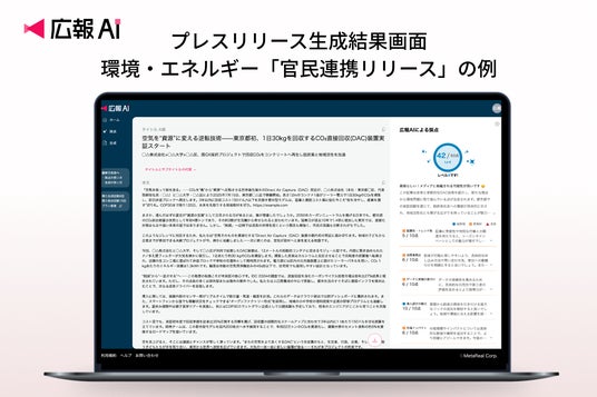 メタリアル・グループの株式会社ロゼッタ(本社:東京都千代田区、代表取締役:五石 順一)が提供する、メディアに掲載されやすいプレスリリースを生成・採点可能な『広報AI』が、環境・エネルギー業界のプレスリリース作成に対応しました。理念や社会的意義が重要視される一方で、専門性が高い内容に対し、共感を生む構成、わかりやすい言葉選びで伝わる広報を支援します。