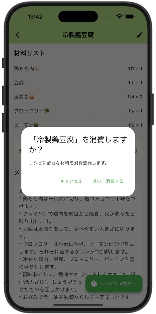 ・「マイレシピ」でまとめて消費登録よく使う食材・日用品のセットを保存し、一括で消費登録可能。在庫登録の手間を削減します。