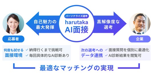 本サービスは、従来の録画選考・書類選考といった画一的な選考に代わり、応募者一人ひとりに最適化されたパーソナライズ選考を実現するサービスです。AI面接官が各応募者の特性や強みを瞬時に分析してその人が最も能力を発揮できる質問や場面設定を動的に生成し、応募者の真の魅力を引き出します。さらに、採用DXサービス「harutaka」で採用戦略から選考、振り返りまで一気通貫でデータを活用できることを活かし、「harutaka AI面接」で収集したデータを後続の選考プロセスに連携することで、「採用の質とスピード」向上を支援します。