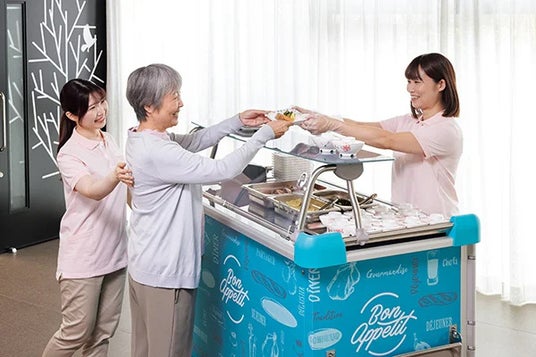 現場の声を反映した機能性と、対面型サービスによるホスピタリティの向上を両立する当製品群は、クックチル・ニュークックチルに対応した設計となっており、人手不足が深刻化する福祉施設の給食現場において業務効率化を力強くサポートします。さらに、完調品(完全調理済み食品)と組み合わせることで、調理から配膳までの工程をより省力化できるため、スタッフの負担軽減にも貢献します。