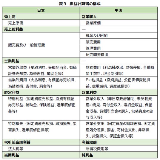 損益計算書の違い:利益表示が、日本は5段階、中国は3段階で構成