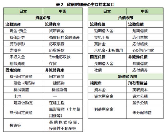 例として、日本の「固定資産」は中国では「非流動資産」と呼ばれ、日本の「有形固定資産」は中国の「固定資産」に相当します。同様に、日本の「固定負債」は、中国では「非流動負債」として分類されます。