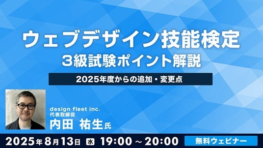 株式会社クリーク・アンド・リバー社(C&R社)は8月13日(水)、「ウェブデザイン技能検定試験」を受験予定の方などを対象に、無料のオンラインセミナー「ウェブデザイン技能検定3級試験 ポイント解説 ~2025年度からの追加・変更点~」を開催します。また、本セミナーの開催に伴い、4月から5月にかけて開催した「ウェブデザイン技能検定3級試験 ポイント解説2025年度版」の全4回を、同日にアーカイブ配信します。