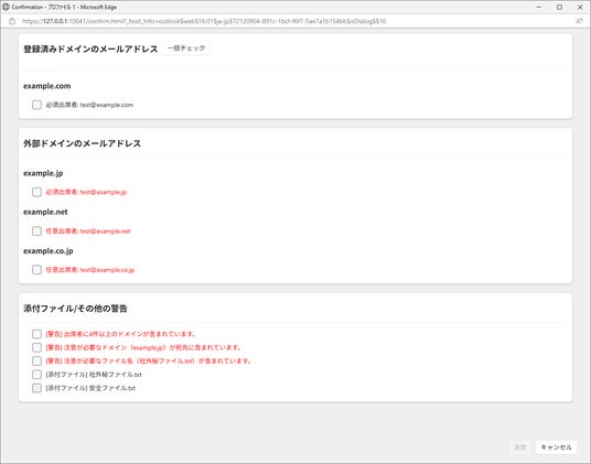 To/Cc/Bcc、添付ファイルなど、重要項目を検出し送信前に確認画面を表示。ミスに気付きやすくなります。