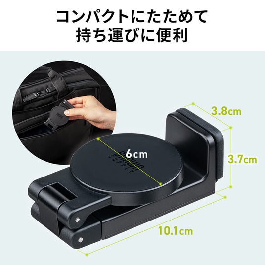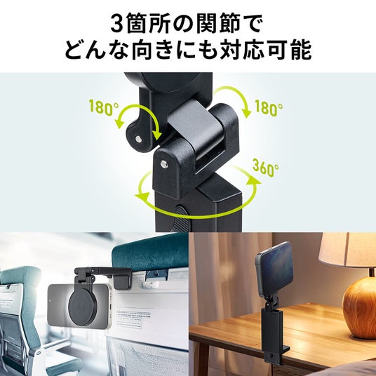 最大3.2cmの厚みに対応するばね式クリップを採用し、旅先のテーブルやキャリーケースのハンドル、ベッドサイドの棚にも簡単に固定できます。工具不要でワンタッチ設置可能です。