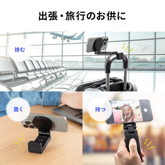MagSafe対応スマホスタンド トラベルスマホホルダー 磁気吸着 360度調整 片手操作 新幹線 飛行機 折りたたみ 持ち運び 旅行 出張 自撮り棒 iPhone Android メタルリング付属
