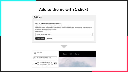 アプリをインストール後、1クリックでストアへのTikTokアイコンアプリブロックを追加できます。難しいコードの編集作業は一切必要ありません。アプリ管理画面から使用中のテーマを選択し、「テーマに追加」ボタンをクリックするだけで自動的にアプリブロックが組み込まれます。これにより、技術的なハードルなく、すぐにTikTok誘導機能をストアに実装できます。