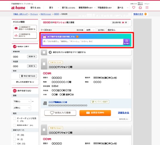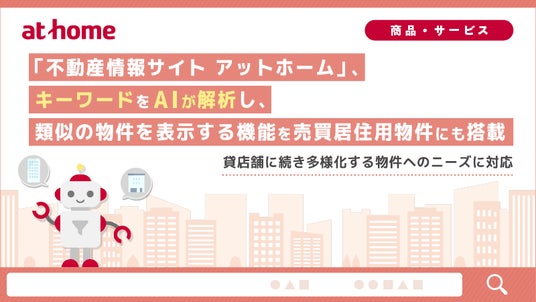 不動産情報サービスのアットホーム株式会社(本社:東京都大田区 代表取締役社長:鶴森 康史 以下、アットホーム)は、「不動産情報サイト アットホーム」内の売買居住用物件検索ページにおいて、入力したキーワードからAIが類似の物件を表示する機能を搭載したことをお知らせいたします。本機能により、売買居住用物件を探すユーザーの快適な物件探しに寄与してまいります。