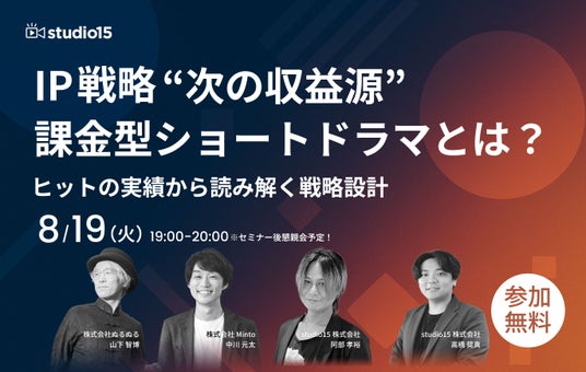 TikTokを中心としたショートムービー(短尺動画)領域で広告代理店事業・プロダクション事業を展開するstudio15株式会社(スタジオフィフティーン、本社:東京都渋谷区、代表取締役:岩佐 琢磨、以下 studio15)は、株式会社Minto(以下「Minto」)、株式会社ぬるぬる(以下「ぬるぬる」)と共に、無料セミナー「IP戦略“次の収益源” 課金型ショートドラマとは?~ヒットの実績から読み解く戦略設計~」を2025年8月19日(火)に開催いたします。