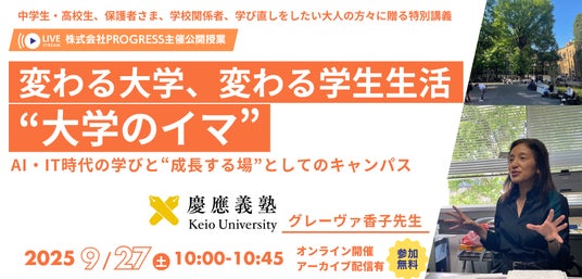 株式会社Progress(福岡市:代表取締役CEO 秦 有樹)は、中学生・高校生ならびに児童生徒の指導に従事されている先生方を対象に、オンラインセミナーEduSemi内にて、SOKUTO! Presents【中学生・高校生向け教養講座 大学の先生による45分特別講義】を開催いたします。