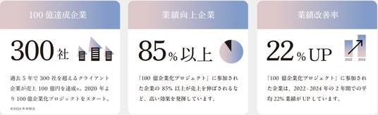 日本経済の持続的な成長を支えるには、地域に根ざした中堅・中小企業の飛躍が不可欠であるという問題意識のもと、本プロジェクトを全社横断の重点テーマに位置づけ、経営資源を集中的に投下。戦略策定から実行支援まで一貫して伴走するコンサルティングサービスを提供しています。2024年末時点で、過去5年で300社を超えるクライアント企業が100億円を達成しました。また、「100億企業化プロジェクト」に参加した企業の85%以上が売り上げを伸ばすなど、高い効果を発揮しています。