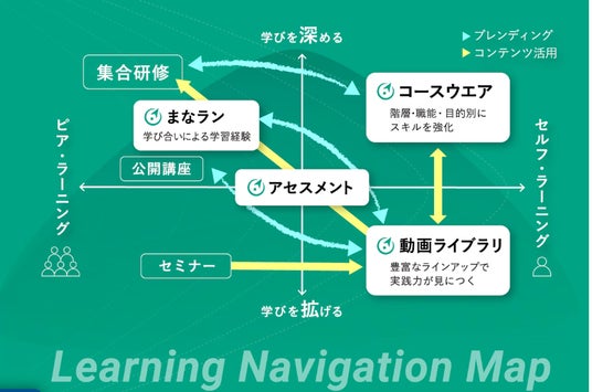 学習効果視点での4象限「学びの深さ・拡がり」x「セルフ(個人)・ピア(集合)ラーニング」で整理した上で、主に4つのサービスをご用意。その他トレンドに合わせて随時開催されるセミナーや、サイコム・ブレインズの提供する研修・公開講座と合わせて、学習効果を全て網羅できるサービスを展開しています。各々をブレンディングさせたり、共通コンテンツを活用したりすることで、定着度を倍増させ、効率的に進められるところも唯一無二のラーニングサービスです。