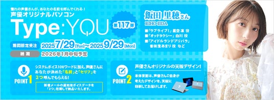 今回ご登場いただく声優さんは、『ラブライブ!』星空凛役、『オッドタクシー』白川役や『アイドルランドプリパラ』 香田澄あまり役などでご活躍の飯田里穂さんです。2025年7月にデビュー25周年、アーティスト活動10周年の節目を迎えた飯田里穂さん。長年応援してくれているファンの皆さまからの個別収録リクエストにお応えできる声優オリジナルパソコンをこの度の記念モデルとして期間限定受注いたします。