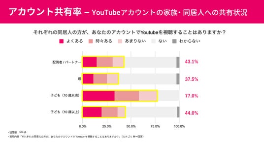 今回のGPの調査で、家族・同居人がいるYouTubeユーザーに対して、家族・同居人へのYouTubeアカウントの共有についてアンケートを実施したところ、家族・同居人の属性によらず40%近くのユーザーが「アカウントを家族や同居人に共有したことがある」という実態が明らかになりました。中でも、10歳以下の子どもがいるユーザーの子どもへのアカウント共有率が高く、77.0%ものユーザーがアカウントを子どもに共有したことがあると回答しました。