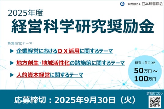 一般社団法人日本経営協会(東京都渋谷区、会長:高原 豪久)は、経営科学分野における基礎研究ならびに応用研究に従事する個人または団体に対して支援することを目的とした「2025年度経営科学研究奨励金」の募集を開始いたしました。