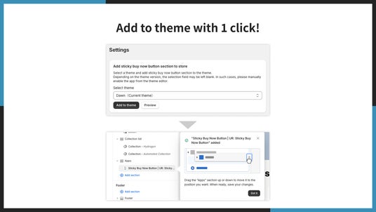 面倒な設定や複雑なコード編集は一切不要です。ワンクリックでお使いのShopifyテーマに追従型今すぐ購入ボタンを追加できます。インストールから実装まで、わずか数分で完了するため、すぐに効果を実感できます。また、テーマを変更した場合でも、再度ワンクリックで新しいテーマに適用できるため、テーマの切り替えを心配する必要もありません。