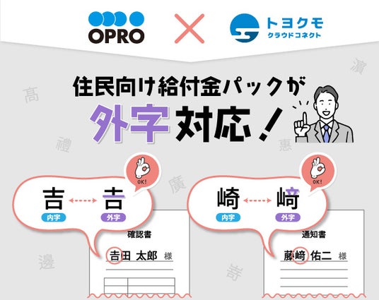 トヨクモクラウドコネクト株式会社(本社:東京都品川区、代表取締役社長:田里 友彦)は、自治体・BPO向けに提供する『住民向け給付金パック』において、外字の帳票出力に対応する新機能を追加しました。本機能の実現にあたり、帳票ソリューションを手掛ける株式会社オプロ(本社:東京都中央区、代表取締役社長:里見 一典)との協業を行います。今回のアップデートにより、自治体は氏名に外字を含む住民に対しても、給付金支給に係る各種帳票を正確に出力できるようになり、住民サービスの質向上と業務効率化に貢献いたします。